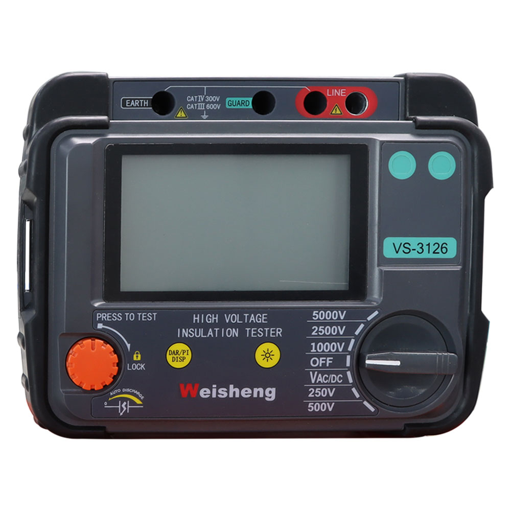 VS-3127 An VS-3127Tástálaí Inslithe Ardvoltaiscuireann sé an cumas chun tomhais friotaíochta inslithe cruinn a dhéanamh suas le voltas tástála 15 kV le friotaíocht uasta de 30 TΩ. Tá cruinneas tomhais friotaíochta ± 5 % ó 1 MΩ go 3 TΩ! I gcás fóntais agus cuideachtaí seirbhíse is tástálaí uile-thimpeall é an VS-3127 lena solúbthacht agus cumas promhadh don todhchaí. Tá an Weshine VS-3127 deartha chun oibriú cibé áit a n-oibríonn tú. Sroicheann uasta voltas rátáil aschuir 7 giar (250V, 500V, 1KV, 2.5KV, 5KV, 10KV, 15KV). Sruth gearrchiorcad uasta 7mA Tástáil friotaíochta inslithe (IR), tástáil innéacs polaraithe (PI), tástáil cóimheas ionsú tréleictreach (DAR). Modh tástála rampa (RAMP), modh tástála friotaíochta scagtha (FR). *Tástáil Cumais (Cap.). Feidhm monatóireachta voltais, monatóireacht a dhéanamh go huathoibríoch ar voltas beo an tomhaiste